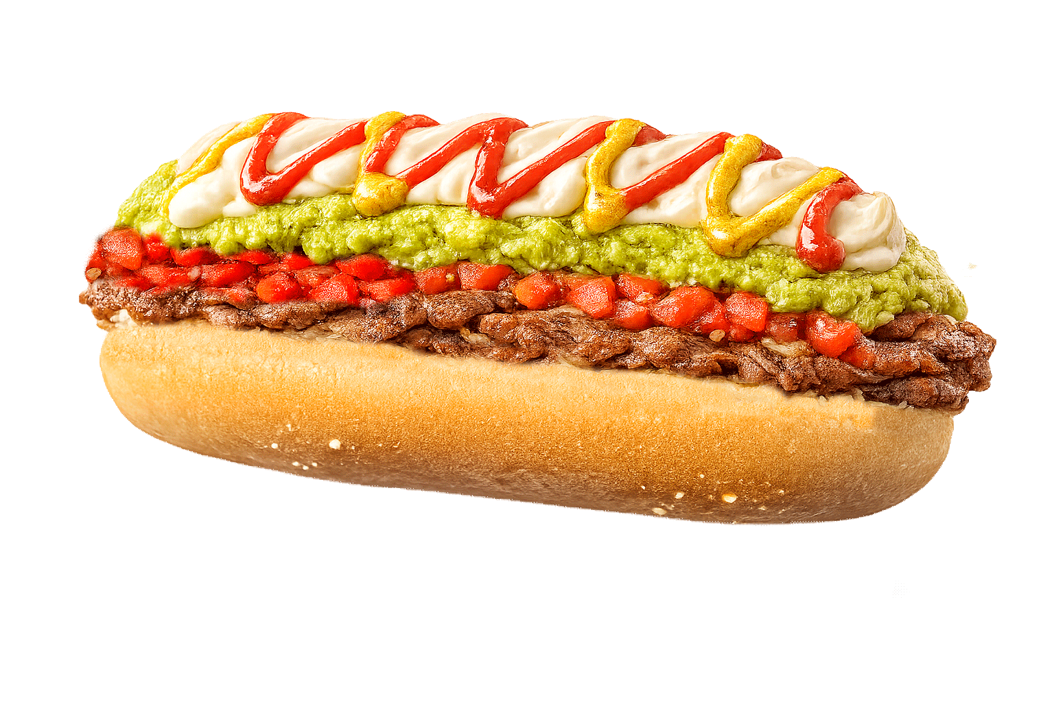 Pan de completo, carne de vacuno, tomate, palta, mayonesa.